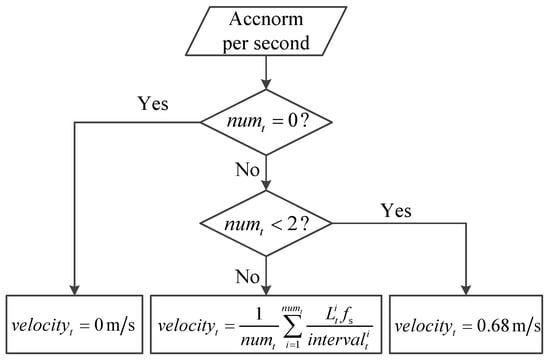 Figure 4 shows the block diagram of velocity calculation. By performing the step detection, we can obtain the number of steps, , in each second. In the t-th second, if , the velocity is set as 0 m/s, which indicates that the pedestrian is not moving, if , the velocity is set as 0.68 m/s, which indicates that the pedestrian walks for one step, and otherwise, we calculate the velocity by