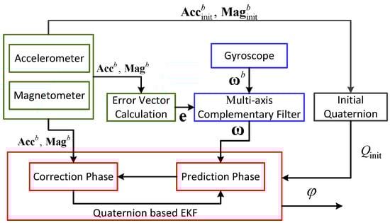 By setting the state variable as a quaternion vector, , and measurement variables as the measurement vectors in the gravity and geomagnetic fields, the state and measurement equations can be constructed as