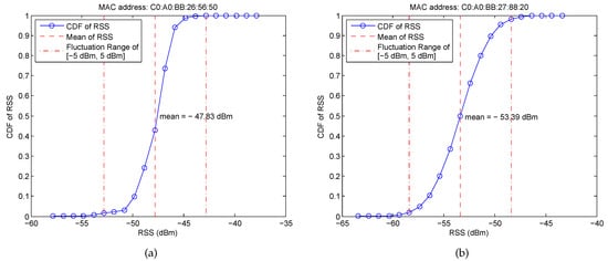 CDFs of RSS from two different APs for 3 min. (a) RSS from AP with the MAC address C0: A0: BB: 26: 56: 50; (b) RSS from AP with the MAC address C0: A0: BB: 27: 88: 20.