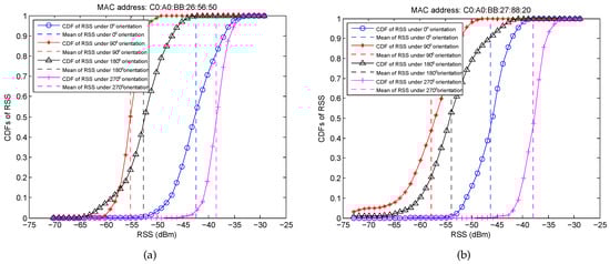 CDFs of RSS under four different orientations for 3 min. (a) RSS from AP with the MAC address C0: A0: BB: 26: 56: 50; (b) RSS from AP with the MAC address C0: A0: BB: 27: 88: 20.
