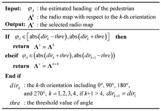In the coarse localization step, we rely on the estimated heading of the pedestrian, , to obtain the best-matching radio map. The pseudo code of this process is shown in Figure 8. Then, we match the newly collected RSS vector against the selected radio map to obtain the best-matching cluster of RPs for the fine localization.