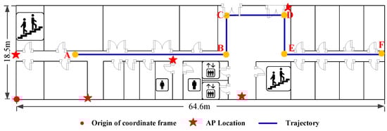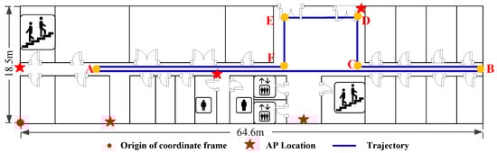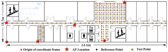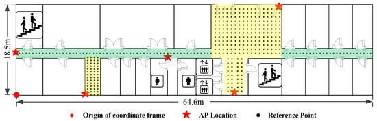 The experiments are conducted on the same floor with the size of in a building, as shown in Figure 9. There are five APs and 363 RPs which are labelled with red stars and black dots respectively in the target environment. The distance between every two neighbouring RPs in the green and yellow shaded areas is set as 0.6 m and 0.8 m. The origin of the coordinate frame is labelled with a red dot, while the X- and Y-axis point rightwards and upwards respectively.