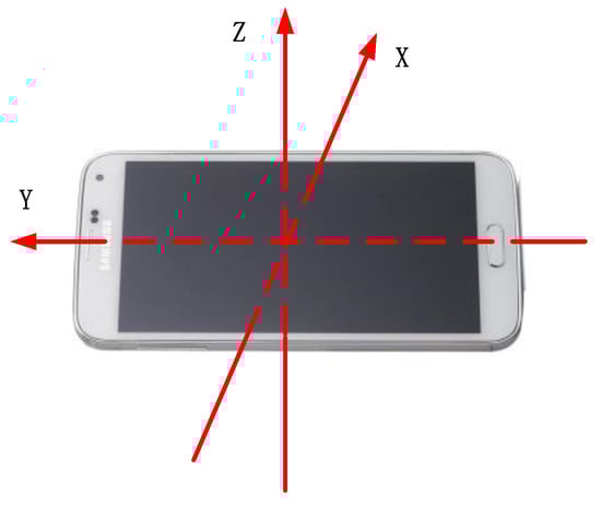 The Galaxy S3 smartphone running under the Android 4.1.2 operation system is selected as the receiver. The interface of our developed software contains two parts, i.e., Android based mobile client (see Figure 10a) and Web page based remote control (see Figure 10b). The body coordinate frame with respect to the receiver is shown in Figure 11. The receiver collects the data from the Wi-Fi module and MARG sensors, and then transmits them to the location server through the Wi-Fi network. The location server estimates the locations of the pedestrian, and then returns the localization results to the receiver and remote control. The refresh rate of the data from the MARG sensors is 50 Hz and the updating rate of the localization is 1 Hz.