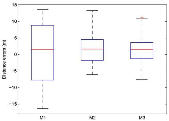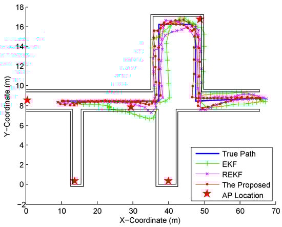 We continue to compare the location tracking performance of the proposed fusion system and the conventional fusion systems, EKF and Robust EKF (REKF) in Figure 24. Compared with the EKF and REKF, the proposed fusion system achieves the best location tracking performance, especially when the pedestrian makes a turn. The CDFs of errors by using different fusion systems are shown in Figure 25. Obviously, the proposed fusion system performs better in localization accuracy than the EKF and REKF since its particle updating scheme results in the well data fusion by combining the optimal IDF and map information. As illustrated in Table 4, the proposed fusion system decreases the mean error by 49.40% and 29.75% and standard deviation of errors by 63.64% and 38.03% from the ones by the EKF and REKF respectively.