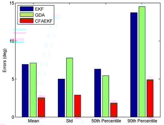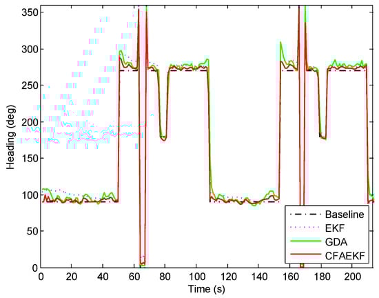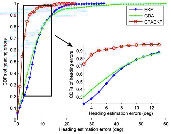Figure 14 shows the CDFs of errors of heading estimation by the proposed CFAEKF and the conventional EKF and GDA. From this figure, we can find that the proposed CFAEKF performs best, with most errors of heading estimation falling within the range of , compared with the EKF and GDA. In addition, Figure 15 shows the statistical errors of heading estimation. From this figure, we can find that the 50th and 90th percentile errors by the EKF, GDA, and CFAEKF are , and , and , and respectively; meanwhile, the CFAEKF reduces the mean error by 57.89% and 58.84% from the ones by the EKF and GDA. To illustrate this result clearer, Figure 16 shows the result of heading estimation. From this figure, we can find that the result of heading estimation by the CFAEKF is more similar to the real heading, namely baseline, compared with the ones by the EKF and GDA.