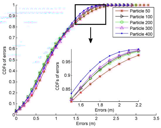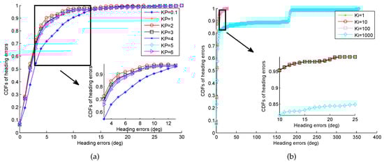 For the CFAEKF, since the output of the gyroscope is modified by the PI controller, the selection of control parameters has a significant impact on the heading estimation. Figure 17 shows the CDFs of errors of heading estimation under different values and . From these figures, we can find that when the value is larger than 1, the value has a slight impact on the error of heading estimation. When the value is smaller than 100, the impact on the error of heading estimation of value is slight, while as the value increases to 1000, more than 10% of the errors are larger than . Due to the consideration of the sensitivity and stability of our system, we set and .