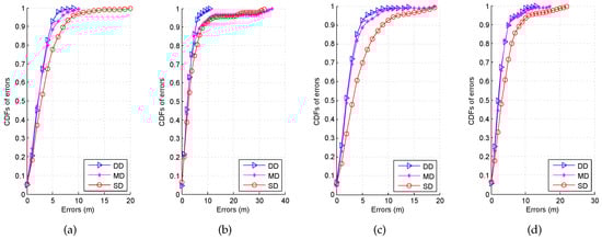 CDFs of errors by using different types of database. (a) Orientation 1; (b) Orientation 2; (c) Orientation 3; (d) Orientation 4.