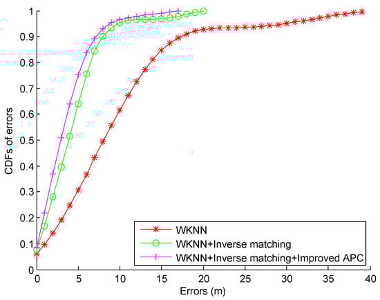 Using the Wi-Fi RSS data collected on the given path (see Figure 19), we compare the CDFs of errors by using the WKNN, WKNN + Inverse matching, and the proposed WKNN + Inverse matching + Improved APC in Figure 21. From this figure, we can find that there is no error over 20 m by the WKNN + Inverse matching and WKNN + Inverse matching + Improved APC, which indicates that the inverse matching approach can effectively decrease the large error probability. In addition, the improved APC is able to reduce the large localization errors further since the process of coarse localization will discard the abnormal RPs which are far away from the corresponding clustering centres. In Table 2, we can find that the proposed approach decreases the mean error by 63.68% and 19.62%, and the 67% error by 61.47% and 20.75% from the ones by the WKNN and WKNN + Inverse matching respectively.