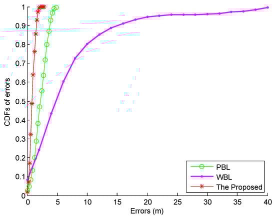 CDFs of errors by the proposed fusion, PBL, and WBL systems.