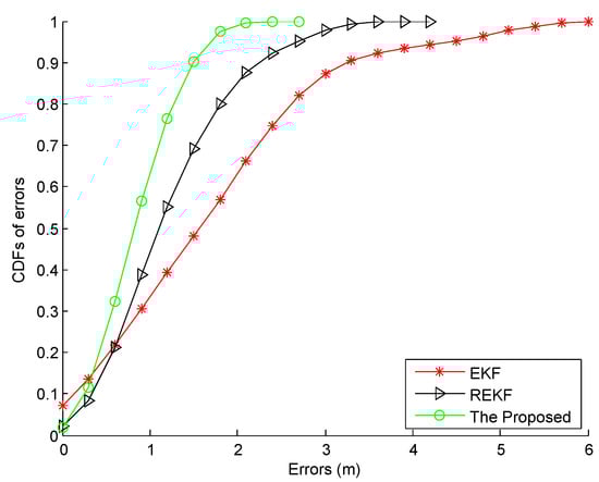 CDFs of errors by using the proposed fusion, EKF, and REKF systems.