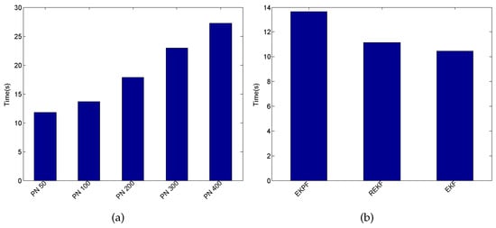 Finally, we investigate the computation time required by the proposed fusion system. The target user walks along a given path with the length of about 142 m, as shown in Figure 19. This process takes this user about two minutes. After that, we calculate the computation time in total involved in the localization process by the proposed system under different particle numbers. In our experiment, all the calculations are conducted on a desktop with the Intel (R) Core (TM) i3-3240 CPU and 4 GB RAM. As can be seen from Figure 27a, the computation time gradually increases with the increase in particle number, whereas the particle number has a slight impact on localization accuracy according to the CDFs of errors in Figure 26. The computation time required by the three different fusion systems mentioned above is shown in Figure 27b. Based on the results in Figure 25 and Figure 27b, we can find that although the proposed fusion system consumes a little more computation time compared with the EKF and REKF, its related localization accuracy is much higher than the other two.