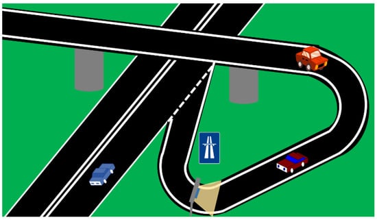 A recent approach suggests that the RSU—s gateways could be placed in the input and output access roads of the highways (typically single lane) as shown in Figure 1. This concept allows the use of only one RSU system, avoiding problems of interference between lanes and a simpler system, since in these lanes—commonly with curved shape—the speeds are much lower than in the highways.