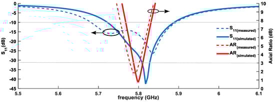 Figure 3 shows a comparison between the simulated and measured results, both of the S11 and axial radio of the manufactured antenna. It is possible to observe a good agreement between simulated and measured curves. In terms of S11—assuming the usual criterion for a good impedance matching an S11 < −10 dB—the patch has a measured bandwidth of 210 MHz (5.68–5.89 GHz). Considered as a good circularly polarized an antenna with an axial ratio lower than 3 dB, the circular patch has a measured 50 MHz bandwidth of circular polarization.
