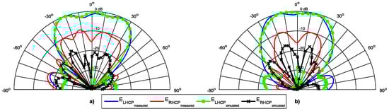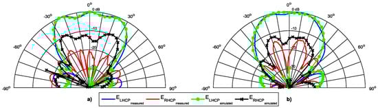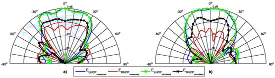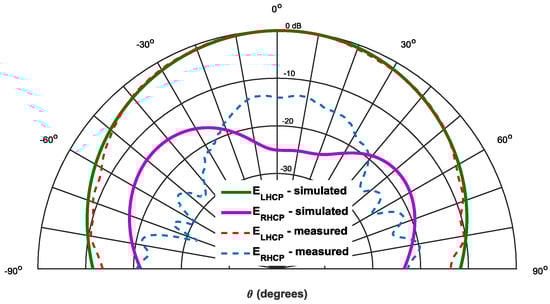 Figure 13, Figure 14 and Figure 15 show the simulated and measured radiation pattern of the array prototype at three different frequencies in the two main radiation planes, φ = 0° and φ = 90°. In each figure, the left (ELHCP) and right (ERHCP) components of the electric field are presented.