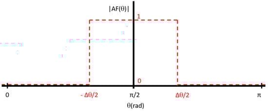 Figure 5 shows the desired array factor for this application, which consists of a uniform (maximum) amplitude over the lane width Δθ, and zero outside this zone. To provide some margin, since the HPBW is lower than the width between nulls of radiation pattern, the calculations were performed to Δθ = 70°. The integral of Equation (2) can be decomposed by