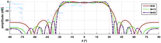 Figure 6 shows the theoretical estimation of the array factor, using distance between elements of d1 = 0.5λ, and with the corresponding weights calculated via FTM applied to each element by varying the number of elements N.