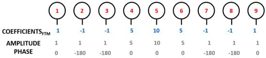 The Fourier transform method (FTM) [9] was used in this array, since this method allows a feed distribution to be found for a set of array elements, so as to achieve a particular radiation pattern. For an odd number of elements (N = 2M + 1), each element feed coefficient can be calculated by the following: