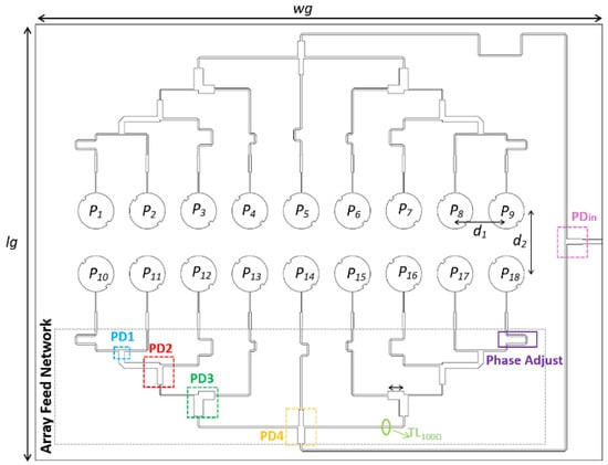 The AFN has a symmetrical arrangement with two branches (fed by PDin divider), compensating the physical rotation between the two lines of nine elements by a 180° phase delay between the two branches. The amplitude distribution was accomplished using unequal power dividers (PD1, PD2, PD3, and PD4) with different ratios. Additionally, each patch was fed by different length of lines, to individually adjust the feed of all the microstrip elements, P1... P18, with the desired phases.
