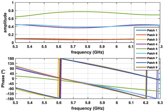 The array was designed and simulated using the Computer Simulation Technology’s Microwave Studio (CST MWS) electromagnetic simulator [10]. Figure 9 shows the simulation results of the signals arriving at each patch of one branch (identical in the other branch) in terms of amplitude and phase. For the 5.8 GHz frequency, these values are summarized in Table 1. It is possible to conclude that both results—amplitude and phases—are consistent with the desired theoretical relationships expressed in Figure 7.