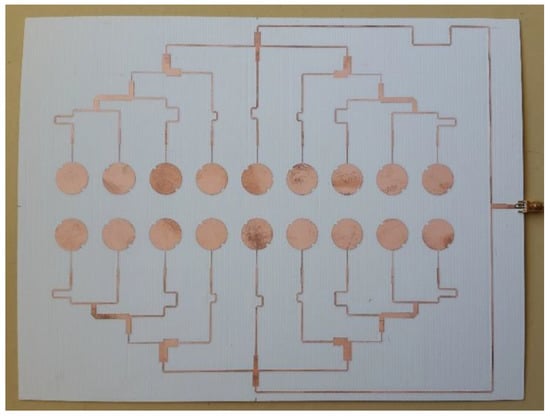 The antenna was designed, simulated, and manufactured using the Rogers RO4725JXR substrate, whose main characteristics are: dielectric constant εr = 2.55, thickness h = 0.78 mm, and loss tangent tgδ = 0.0026. The prototype is shown in Figure 10, and presents global dimensions Wg × Lg = 286 × 218 mm2.