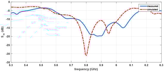 The prototype was measured, and a comparison between the simulated and measured S11 of the antenna is presented in Figure 11.