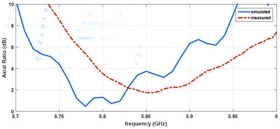 The Axial Ratio (AR) is a parameter that allows the quality of the circular polarization of an antenna to be characterized. Figure 12 illustrates the simulated and measured ARs of the designed antenna array. It is possible to observe an acceptable agreement between the two results, with only a small deviation.
