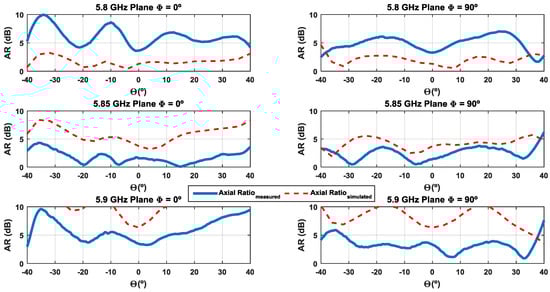 Figure 16 shows the axial ratio as a function of the main lobe angles of the radiation pattern at the three measured frequencies in the two main planes. The values are in agreement with the expected, taking into account the slight shift in the frequency of axial ratio and the rejection between components observed in the radiation pattern. Assuming a rejection greater than 15 dB and greater than 10 dB—corresponding to an axial ratio less than or equal to 3 dB and 5.7 dB, respectively Equation (1)—it is possible to observe that the DSRC standard is ensured at 5.85 GHz.
