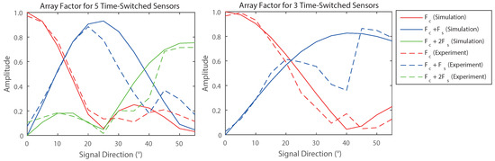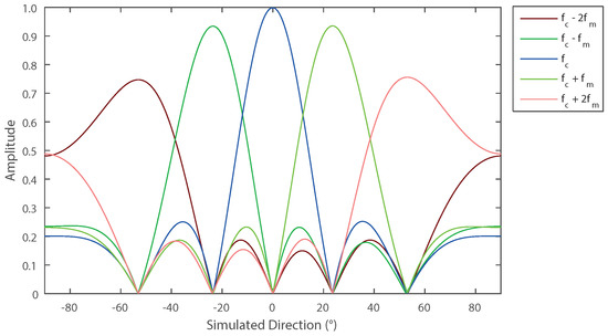 Figure 2 shows the normalized response of the dominant harmonics (i.e., , , ) in a five-element array with each harmonic having a maximum amplitude at a different angle (i.e., , , ). From Equation (7), it can be shown that the direction in which the maximum response occurs for each harmonic can be calculated as: