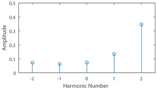 For example, if an unknown signal source produces the frequency spectrum shown in Figure 3 when sampled with a five-element array, then the power levels of harmonics 1 and 2 are taken as and respectively and angles and are found from Equation (8) as and . Using Equation (9), the estimated signal DoA is .