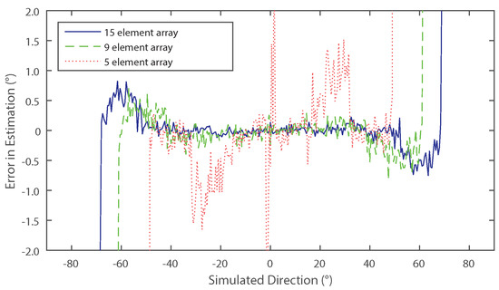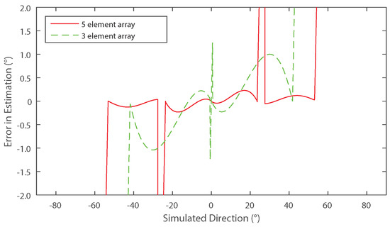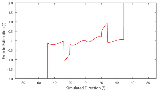 The abrupt changes in estimation error observed at approximately – for the five-element array in Figure 5 are due to the algorithm selecting an incorrect smaller harmonic close to the null regions as explained in Section 2.2.1. In spite of there being no noise in this simulation, effects such as under-sampling and numerical errors still give rise to errors close to the null. If now we consider the estimation error for (shown as the dotted line in Figure 5) and then the results are re-analysed using the same method with new values of harmonic data, the inaccuracies can be mitigated by taking a composite of the two traces. Since the value of N has changed, the null regions located using Equation (8) for and are non-coincident. It is known at which angles the inaccuracies will occur and hence by selecting the result of either or , the best case accuracy overall can be achieved as shown in Figure 6.
