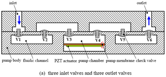 When the PZT actuator is driven by alternating voltage, a piezoelectric membrane pump can transfer the mechanical energy of membrane deflection into fluid movement. Then the mechanical vibration of the piezoelectric membrane is transmitted to the check valves through the working fluid. Apparently, it takes some time to perform the transmission process. The valve is constrained by the force of inertia caused by the working fluid. Therefore, the actions (open/close) of the passive check valves always lag behind the vibration of the PZT actuator. Ideally, the outlet valve should be closed when the inlet valve opens during the expansion stroke. However, because of the outlet valves’ closing lag, some fluids which have been discharged are redrawn into the pump chamber through the outlet valve, i.e., backflow occurs. Similarly, because of the closing lag from the inlet valves during the compression stroke, some fluids which have been sucked are forced out of the pump chamber through the inlet valve over again. So far, various research efforts have mostly focused on adopting new materials and techniques, developing new valve types and optimizing the existing check valves. Inspired by the works in [36,37], where Hwang et al. designed a leakage barrier in the chamber to reduce leakage flow without interfering with the net positive fluid flow, and Ma et al. added a secondary chamber to obstruct the stream and reduce the backflow toward the primary chamber, a single-active-chamber piezoelectric membrane pump with multiple passive check valves is proposed in this paper, as shown in Figure 2. This configuration of multiple passive check valves is intended to prevent the backflow toward the working chamber. Then each check valve can be regarded as a leakage barrier. During the expansion stroke, multiple outlet valves are able to reduce the backflow of the fluids which have been discharged. Likewise, multiple inlet valves can effectively prevent the fluids which have been sucked into the pump chamber from flowing back into the inlet.