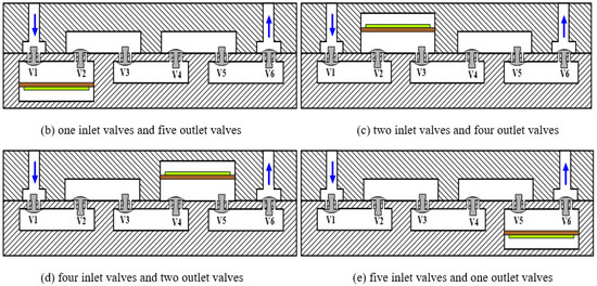 In this work, six similar passive check valves were adopted to conduct because the piezoelectric pump cannot properly function if the number of check valves is too many. Actually, a piezoelectric membrane pump can have a different number of inlet and outlet valves. The number and configuration of check valves must have a different influence on the piezoelectric membrane pump with multiple valves. Therefore, we mainly focus on the influence of multiple check valves’ various configuration on the performance of the piezoelectric membrane pump in this paper. As mentioned before, in order to characterize and fully compare the different performances of the piezoelectric pump with multiple check valves, five piezoelectric membranes are used. Then the configuration of inlet and outlet valves can be changed by means of activating any one PZT actuator, meanwhile, the inactive piezoelectric membranes consists of fluidic channels. Thereby, we realize the configuration changes without altering any of the mechanical structure, ensuring the same measurement conditions.