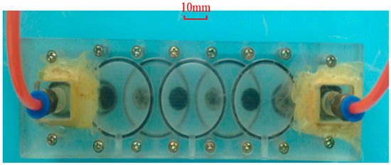 In this work, six passive check valves are used to construct the piezoelectric membrane pump. As shown in Figure 2, Vi (i = 1, 2, …, 6) represent the passive check valves. The casting-rubber moulding method was adopted to form six umbrella-shaped check valves and six little valve orifices with a diameter of Φ1.2 mm were designed to enhance reverse-check capability. The piezoelectric membrane with a size of Φ35 mm × 0.53 mm is a commercial piezoelectric sound component produced by Murata Manufacturing Co., Ltd. (Nagaoka, Japan), where the thicknesses of the piezoelectric component with the diameter of Φ25 mm and the metal plate with the diameter of Φ35 mm are 0.23 mm and 0.3 mm, respectively. In fact, we adopted five similar piezoelectric membranes to characterize the piezoelectric membrane pump with different numbers of inlet and outlet valves. The pump shell and body are made of polymethyl methacrylate which has the advantages of easy processing, light weight, insulation and easy observation. After two umbrella-shaped check valves close to the piezoelectric membrane as well as the membrane are assembled, a pumping chamber is ready. The room between other two neighbouring check valves forms several fluidic channels. The prototype photograph of the single-active-chamber piezoelectric membrane pump with multiple passive check valves is shown in Figure 3.