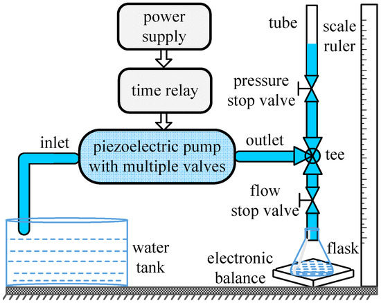 The performance of the proposed piezoelectric pump needed to be experimentally measured in terms of flow rate and backpressure that the prototype pump could achieve. Figure 4 depicts the schematic diagram of the experimental setup. The tap water at room temperature, as the most representative working fluid, is used as working fluid. Two plastic tubes are connected to the inlet and outlet of the prototype pump. A digital PZT power supply (P211, SANKI, Nagoya, Japan) is used to drive the piezoelectric membrane pump. The power supply can provide a sinusoidal voltage with a variable frequency of 60–400 Hz and an AC voltage range of 0–240 V. An electronic balance with a division value of 0.01 g and a repeatability of 0.01 g is used to measure the outflow. A time relay is used to set the time interval to obtain the average flow rate. The time interval of sixty seconds is set in each measurement. According to the energy equation, the water column height which is perpendicular to the water free surface is measured by a scale ruler in order to obtain the pumping pressure value (kPa). The measurement of flow rate or backpressure is carried out through opening and closing corresponding stop valves. The tee, pressure stop valve and flow stop valve are used to choose the measured object. When the pressure stop valve is closed, the flow characteristics can be tested. On the contrary, backpressure characteristics can be obtained. Using this setup, a series of experiments are conducted to explore the performance of the single-active-chamber piezoelectric membrane pump with multiple passive check valves.