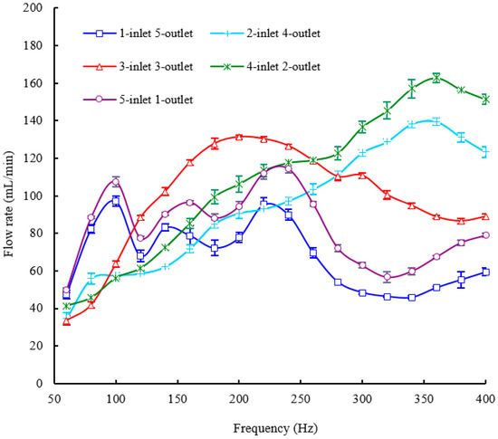 It is found from the experimental results that different configurations of multiple check valves have a strong influence on the flow rate and backpressure of the piezoelectric membrane pump. In order to demonstrate the performance differences caused by different numbers of inlet and outlet valves intuitively, all the aforementioned frequency-dependent flow rate curves are plotted and compared in one figure, and so are the backpressure curves. They are illustrated in Figure 5 and Figure 6, respectively.