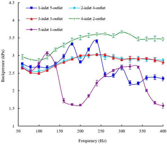 The backpressure versus frequency characteristics of the pump with different configurations of inlet valves and outlet valves.