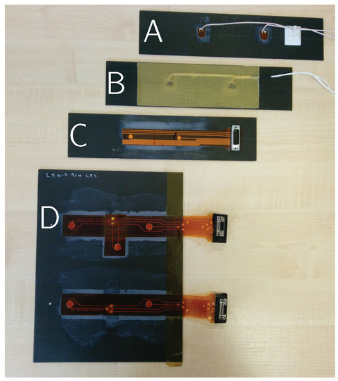 Figure 4a. Each of these had PZT discs 10 mm × 0.2 mm (diameter × thickness) potted in proprietary resin covered with polyimide (Kapton) film, giving overall dimension of 17 mm × 13 mm. Transducers soldered and electrically connected with RG178 cable (MIL-C-17G).
