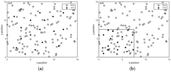 For numerical investigation, we assume 17 AMs, and 120 BMs are randomly distributed inside a square-region: , where unit of length. We use two different configurations of AM distribution: (a) uniformly distributed over the whole area (as shown in Figure 1a) and (b) uniformly distributed in the lower left corner (in Figure 1b). We assume a distance–power gradient of , a standard deviation of measurement of dB and transmit power of dBm for all of the transmitting machines. We also assume that BMs can hear the signals from those AMs or VAMs, the actual distance to which is not greater than R, which is referred to as a communication range.