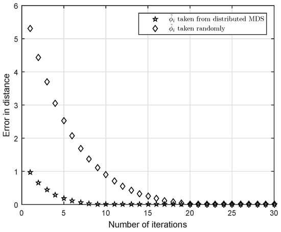We have suggested an algorithm of determining a good initial position of BMs using MDS. Figure 2 compares convergence speeds of the localization algorithm provided in this paper when a random initial position or a initial position is used. For the test, an actual location of BM is investigated and R is assumed to be 2. A randomly generated initial point is and an initial point obtained from MDS is . From Figure 2, we can see that the convergence is faster if the initial point from MDS is used. When we take for a stopping criterion of the algorithm, a good initial point terminates the localization at nine iterations compared to 20 iterations with the random initial point. Both are convergent at the same position .
