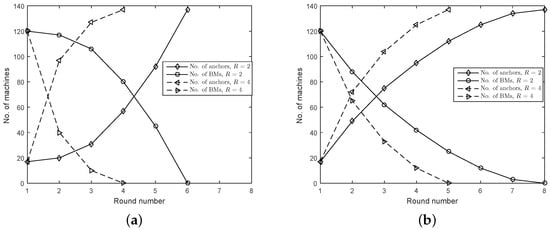 In Figure 3a,b, the effect of AM distributions on the localization speed is investigated. They plot the number of machines marked as anchors (AMs or VAMs) and BMs at the start of each round in GSAP. In Figure 3a, at round 5, all of the 120 BMs can determine their locations when . If , only three rounds are enough. If AMs are located in the lower left corner, seven and four rounds are needed to determine the location of 120 BMs when and , respectively. It is seen that a biased-distribution of AMs can severely degrade the localization speed, especially when the communication range is relatively small.