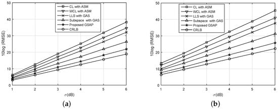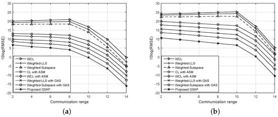 Figure 4 shows the effect of on the performance of localization algorithms. is assumed. In the simulation, identical is applied for each transmitter–receiver pair. For CL and WCL, anchor selection methods (ASM) provided in [] are used, and the greedy anchor selection (GAS) proposed in this paper is used for LLS and Subspace techniques. The RMSE degrades (gets greater) as increases for every algorithm tested. The proposed GSAP, however, provides the best performance regardless of the assumptions on the AM distribution. Comparing the results from the two AM distributions, we can see that if AMs are uniformly distributed over the whole area, RMSE gain is about 4.165 dB compared with the locally distributed case at . In both of the cases, the performance gap between GSAP and CRLB increases according to the increasing uncertainty.