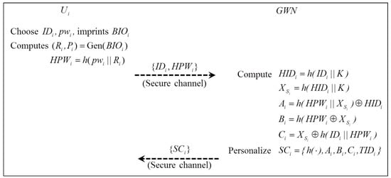 - computes , , , , . Then, sends the smart card to via a secure channel. stores in its storage, where , is a nonce, and , where means contains nothing.