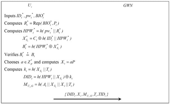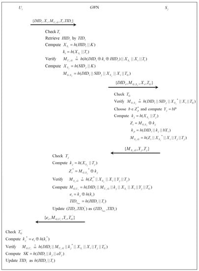 - :After receiving , checks the validity of and retrieves from . If no is found, checks . If it still is not found, rejects the login request; otherwise, computes and . Then, verifies . If it is valid, authenticates and computes , then sends to , where is the current timestamp.
