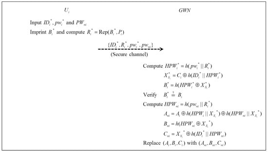- Once the user performs the password change phase, the previous password is changed into , and information in the smart card, , is replaced with .