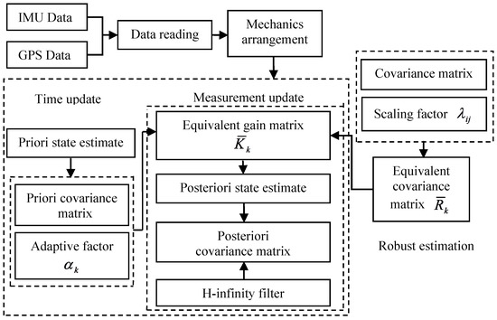 Accurate Global Positioning System (GPS) measurement data can be used to control the Inertial Navigation System (INS) accumulative errors. On the other hand, the INS can be used in cases when the GPS fails. Thus, the integration of GPS and INS has been widely adopted in the field of dynamic navigation and positioning. The Kalman filter is one of the most celebrated real-time optimal estimators [1], and therefore it has become the basic data-fusion approach in navigation and positioning [2,3]. Unfortunately, the Kalman filter performance depends on many factors, thus it cannot meet the requirements of certain nonlinear systems and the performance is susceptible to outliers. Hence, many improved filtering algorithms were proposed, for instance, the unscented Kalman filter [4,5], the particle filter [6], the robust filter [7,8], the adaptive filter [9,10,11,12], and so forth. The nonlinear problem can be handled by the unscented Kalman filter or the particle filter, however, they both become unstable in a high-dimensional case. On the other hand, the cubature Kalman filter is a recently developed nonlinear filtering algorithm [13]. Compared with the unscented Kalman filter, the cubature Kalman filter shows better performance in stability; therefore, it has been adopted in the GPS/inertial measurement unit (IMU) integrated navigation system [14]. Many forms of robust filtering algorithms were proposed to control the influence of outliers, but the influence of the model errors was neglected. The multiple-model-based adaptive estimation (MMAE) and innovation-based adaptive estimation (IAE) represent the adaptive Kalman filtering approaches. In the MMAE, there is a set of Kalman filters which work in parallel under different models, while in the IAE the adaptation is applied directly to the statistical information. Moreover, the IAE is more applicable to the GPS/INS integrated navigation systems [9]. The DIA (detection, identification, and adaptation) methods represent the recursive testing procedures, and they were proposed to eliminate the effects of outliers [15]. In the DIA methods, firstly, the model errors are detected and identified, then deviations of the state estimates caused by the model errors are eliminated, and finally, the adaptation in which the model is recovered from the identified errors, is implemented. However, the identification is quite difficult, especially when the measurements are not accurate [16].
