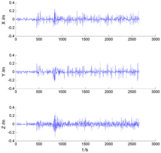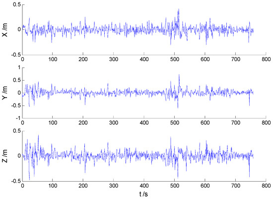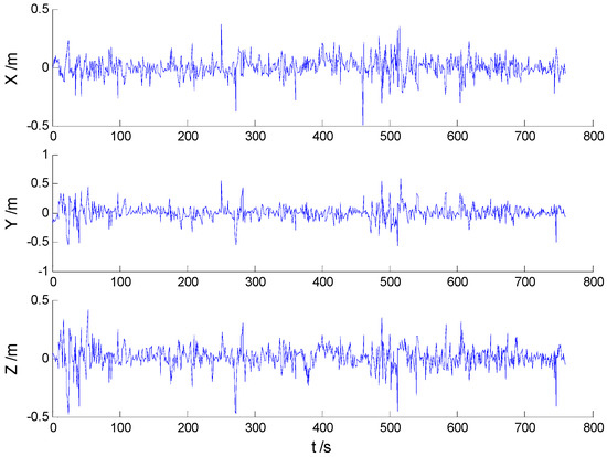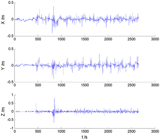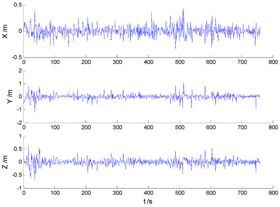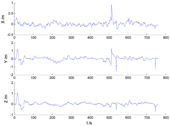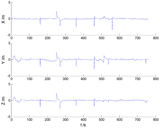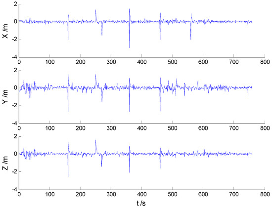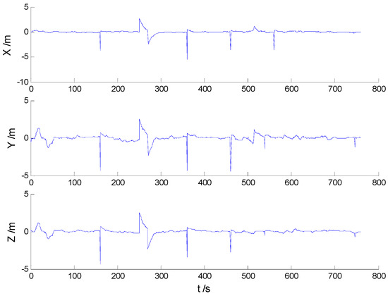 In these experiments, we used data from the Section 5.2.1, but the single gross errors were added artificially to the GPS measurement data at the 160th, 360th, 460th, and 560th epochs, respectively, and the constantly changed outliers were added to all epochs between the 251th and 280th epochs. Then, the previously used schemes were implemented again, and the obtained position errors of all schemes are displayed in Figure 10, Figure 11, Figure 12 and Figure 13.