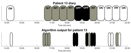 Patients reported an average of 26 annotations (13 h), meaning that the diary was far from being completely filled (approximately 60 annotations). However, patients 9 and 13 diaries are very complete in the number of entries (52 and 48 annotations respectively), which are very useful to validate the output of the algorithms in an optimal sense. In the case of patient 13, as can be seen in Figure 6, the output of the algorithm fully agrees with the annotations in the patient diary. Furthermore, in Table 5, some cases where a low number of daily patient labels have been validated are observed. For example, in the case of patient 15, two problems have been detected: on the one hand, the low number of entries (13 in 3 days) and, on the other hand, in OFF state, the patient could not or had no desire to move and, therefore, the algorithm was not able to provide a decision. In the case of patient 6, the problem is related to the high rate of intermediate states detected by the sensor. The algorithm output determines a great number of intermediate states because the patient walks briefly and also in very short stretches. This causes the algorithm not to be able to clearly evaluate gait and, thus, the motor state of the patient.
