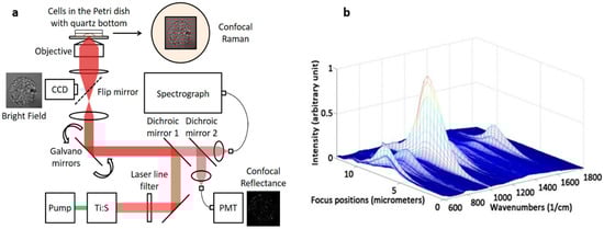 Prior to cellular imaging, the axial resolution was measured using 1-µm diameter polystyrene beads (07310-15, Polysciences, Inc., Warminster, PA, USA). Polystyrene beads were dispersed in methanol and dried on top of a quartz coverslip (043210-KJ, Alfa Aesar, Haverhill, MA, USA). A series of Raman spectra were collected while the sample was moved in and out of the focal plane using the piezo actuator. The intensity of the polystyrene Raman spectra changes with respect to the sample position and is strongest when in focus (Figure 1b).