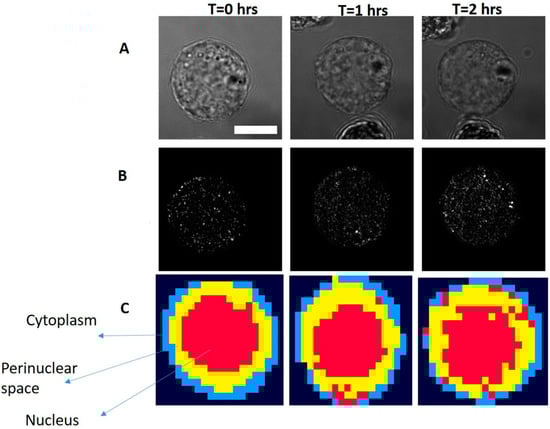 Temporal monitoring of the same RPMI8226 cell after applying 50 nM Bortezomib at time zero (Scale bar: 5 µm): (A) bright field image; (B) confocal reflectance (binary mask is applied to target cell to eliminate the effect from outside of the cell); and (C) Four cluster Raman images. Different intracellular regions are marked.