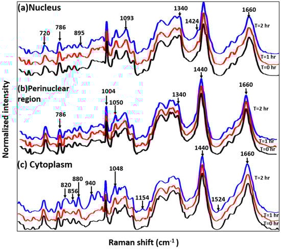 Mean baseline corrected spectra extracted from individual clusters annotated to an intracellular region in cluster Raman image: (a) Nucleus; (b) Perinuclear Region; and (c) Cytoplasm. Spectra are vertically offset for better visibility.
